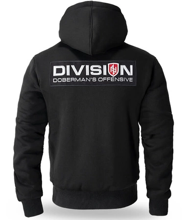 Przy kapturze grube sznurki z metalowymi okuciami, na przodzie dwie naszywane kieszenie, lekko jeżdżący suwak. Bluza wykończona wytrzymałymi ściągaczami na rękawach i na dole. Z przodu na sercu posiada małe logo w kształcie tarczy z symbolami runicznymi, a na plecach efektownie naszyty większy napis firmowy Division Doberman`s Offensive, również z tarczą z wpisaną runą.