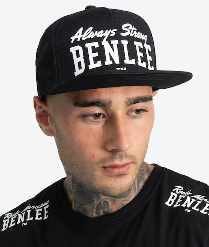 Bardzo dobra jakościowo czapka z daszkiem typu snapback marki BENLEE Rocky Marciano, z regulacją obwodu za pomocą zatrzasków. Składa się z sześciu paneli, wyposażonych w wentylację. Czapka w klasycznym czarnym kolorze.