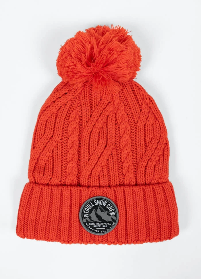 Czapka posiada modny pompon i dużą okrągłą naszywkę żakardową z przodu, z górskim motywem i napisem Pitbull Snow Crew Hardcore Adventure.