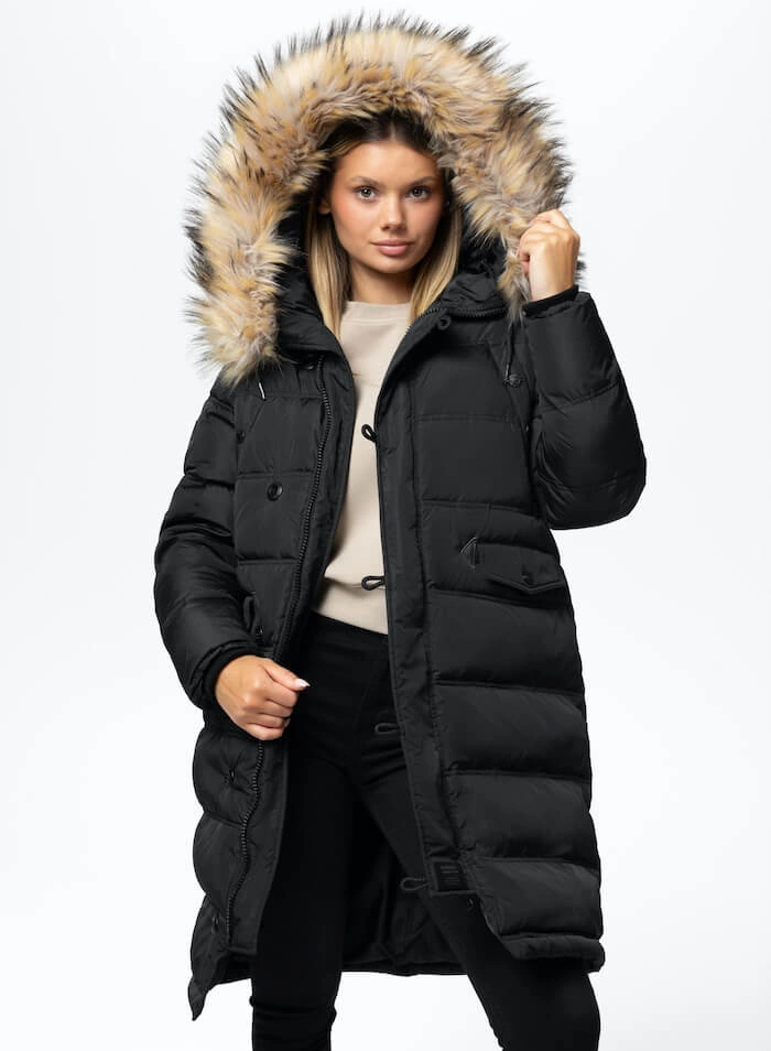 - Zimowy pikowany damski płaszcz z kapturem, dłuższy zimowy fason typu płaszcz/parka.