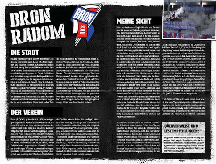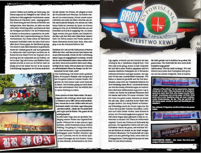 Niemieckie wydawnictwo poświęcone w całości polskiej scenie kibicowskiej. Na 160 stronach formatu A5 (odrobinę większego od TMK) znajdziesz obszerne i okraszone fotkami wywiady z następującymi ekipami: Broń Radom, Jagiellonia Białystok, Czuwaj Przemyśl, Zawisza Bydgoszcz, Tarnovia Tarnów i Lech Poznań. Profesjonalny skład, pełen kolor, papier kredowy.