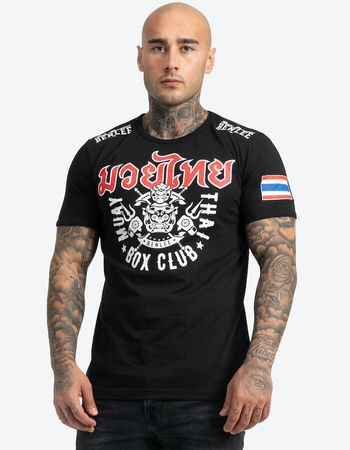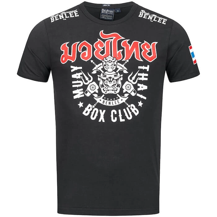 Konkretna koszulka sportowa z BENLEE Rocky Marciano Thaicity z dużym nadrukiem na klatcie piersiowej o tematyce muay thai i mniejszymi motywami na rękawku oraz z tyłu na karku. Bardzo dobra jakość materiału (100% bawełna), wysoka gramatura: 200 gr/m.