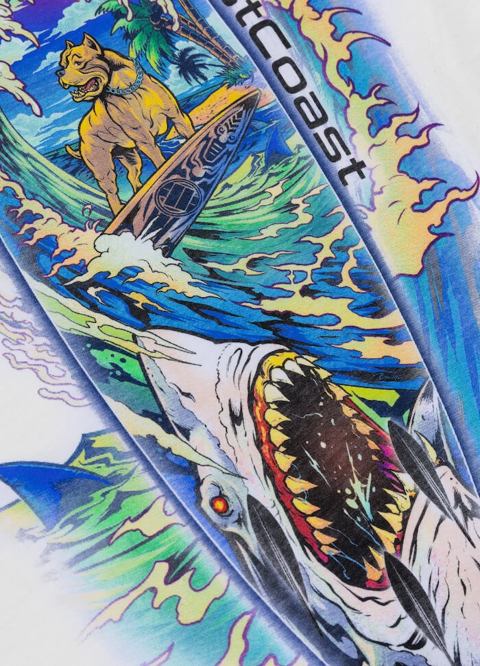 Na piersiach posiada duży napis firmowy, a na plecach dużą grafikę w wyrazistym wakacyjnym klimacie, charakterystyczną dla ciuszków Pitbulla.