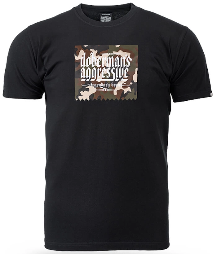 Koszulka Dobermans Aggressive Camo TS395, wykonana z bardzo dobrej dzianiny bawełnianej. Jest to militarna pozycja odzieży ulicznej, z dużym prostokątnym nadrukiem na piersiach w kolorystyce moro. Tył bluzy gładki. Tył gładki.