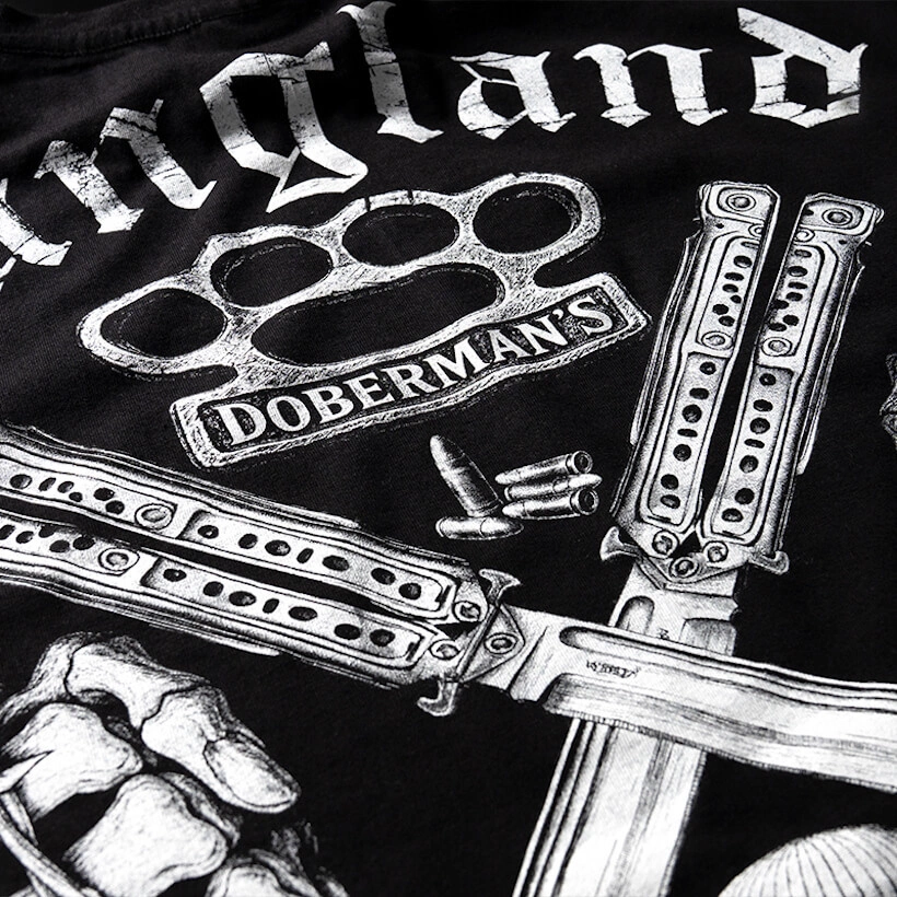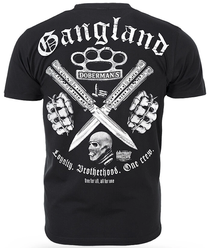 Koszulka Dobermans Aggressive One Crew Gangland TS384, wykonana z bardzo dobrej dzianiny bawełnianej. Na plecach posiada nadruk w klimacie uliczno-chuligańskim. Mniejszy motyw kastetu umiejscowiony został z przodu na piersi. Nadruki wykonane techniką termotransferu.