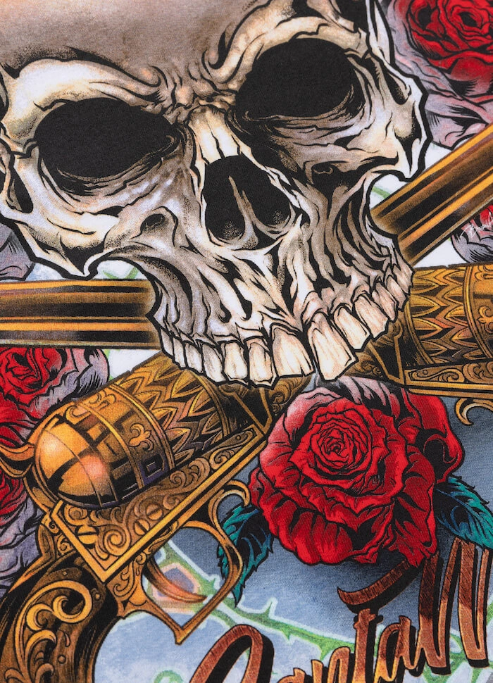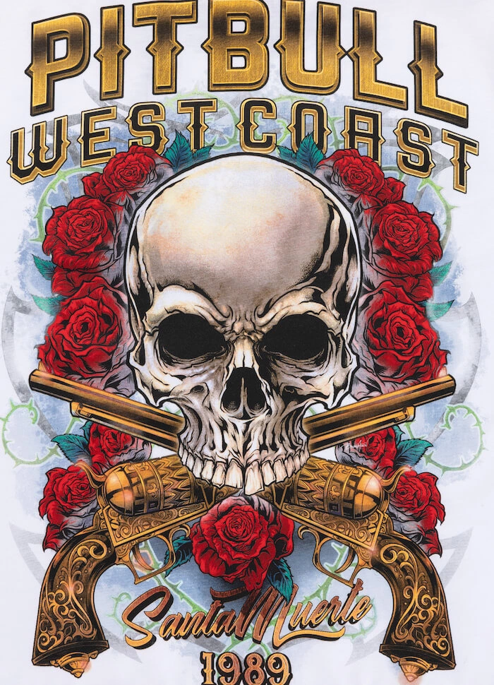 Jak każdy t-shirt Pit Bull, również i ten opowiada jakąś historię. Jest to wyrazista propozycja graficzna, której tematyką jest Święta Śmierć - zakazany kult, popularny w krajach Ameryki Łacińskiej, zwłaszcza w Meksyku, gdzie Santa Muerte jest uważana za patronkę przemytników i gangsterów. Główny motyw widnieje na plecach i jest to rozbudowana grafika z trupią czaszką, otoczoną różami. Na dole i na rękawku wszyte są żakardowe metki firmowe.