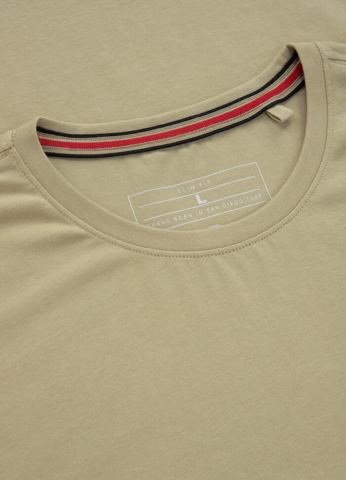 Jest to model o dopasowanym kroju slim fit, wykonany ze znakomitego jakościowo i lekko elastycznego materiału (95% bawełna, 5% spandex). Od wewnątrz, przy szyi wszyta jest delikatna lamówka, zabezpieczająca skórę przed podrażnieniami.