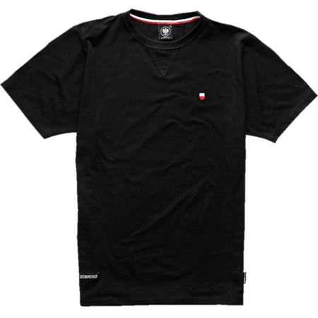 Koszulka patriotyczna UltraPatriot z małą tarczą w polskich barwach narodowych, przypadnie do gustu wszystkim, szukającym stonowanej odzieży z dyskretnymi zdobieniami i niewielkimi motywami firmowymi.