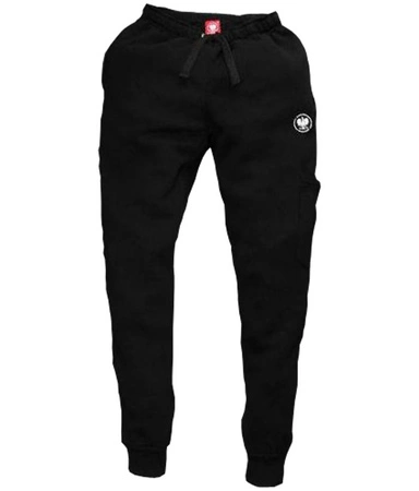 Wygodne dresy patriotyczne Ultrapatriot w kolorze czarnym, z gumową naszywką na nogawce z motywem Orła Białego i ściągaczami na dole.