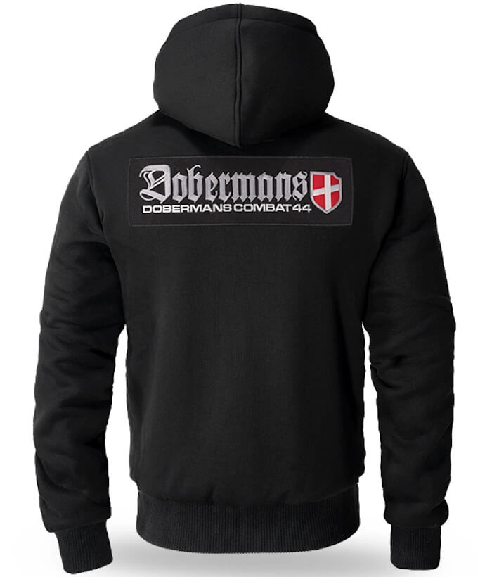 Przy kapturze grube sznurki z metalowymi okuciami, na przodzie dwie naszywane kieszenie, lekko jeżdżący suwak. Bluza wykończona wytrzymałymi ściągaczami na rękawach i na dole. Z przodu na sercu posiada małe logo w kształcie tarczy z symbolami runicznymi, a na plecach efektownie naszyty większy napis firmowy Doberman`s, Combat 44 również z tarczą z wpisaną runą.
