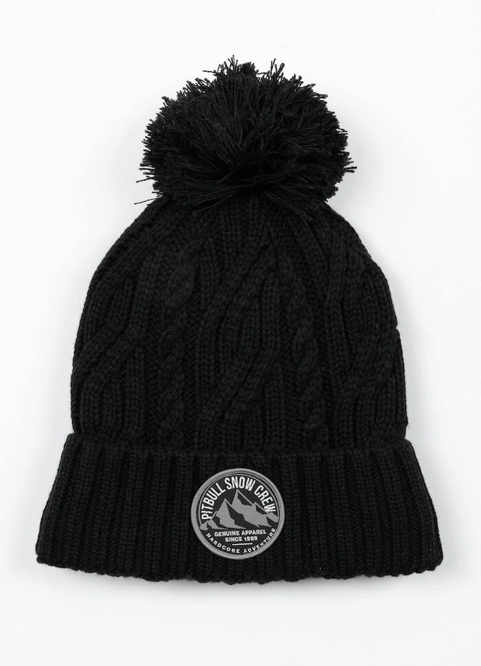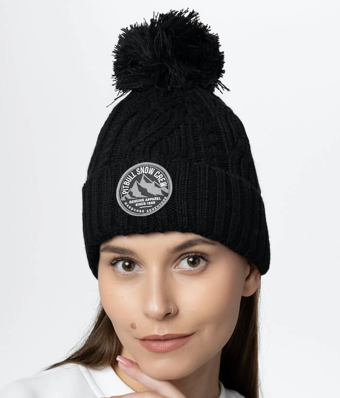 Czapka posiada modny pompon i dużą okrągłą naszywkę żakardową z przodu, z górskim motywem i napisem Pitbull Snow Crew Hardcore Adventure.