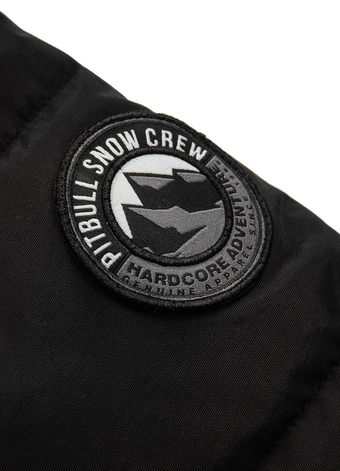Jest to nieco wydłużony model kurtki Pit Bull o delikatnie pikowanym materiale i stonowanym designie, jedyny większy motyw firmowy stanowi okrągła naszywka na rękawie z napisem Pitbull Snow Crew Hardcore Adventure i górskim, zimowym motywem. Wszystkie guziki, uchwyty suwaków i klamry posiadają wytłoczone logo producenta. W karku wszyta jest konkretna metka żakardowa. Styl kurtek alaska podkreśla pionowa klapa z zatrzaskami, pod którą biegnie główny zamek zapinający kurtkę.