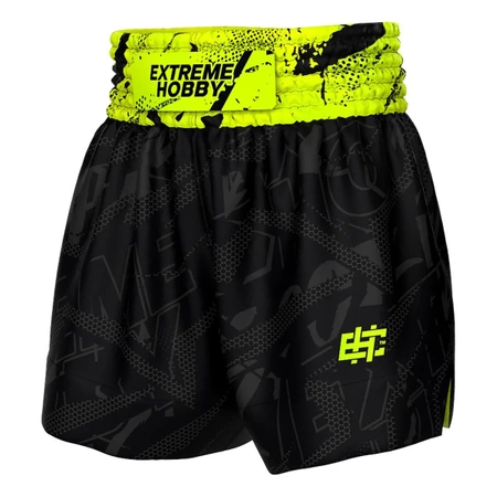 Męskie ultra lekkie spodenki muay thai, wykonane z satyny – miękkiego i oddychającego materiału, bardzo przyjemnego w użytkowaniu, popularnego ze względu na wygodę i głębię mieniących się kolorów. Produkt stworzony z wykorzystaniem farby fluorescencyjnej.