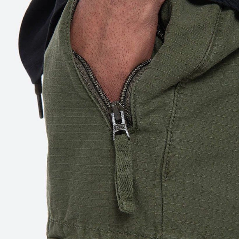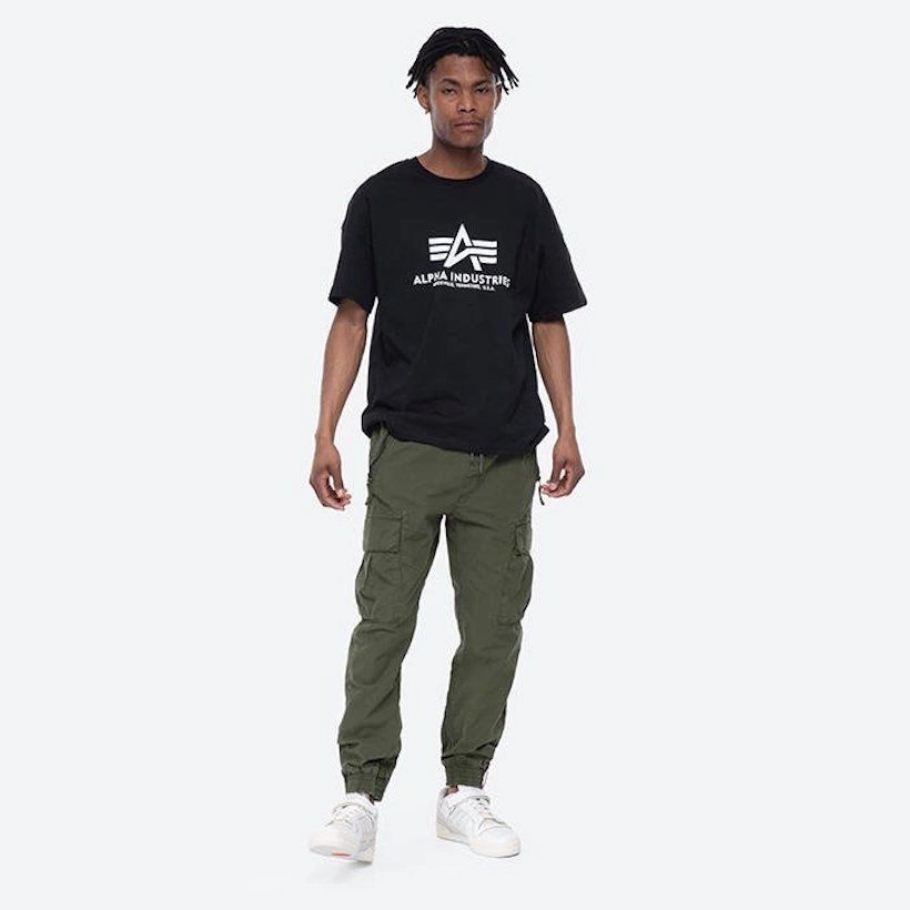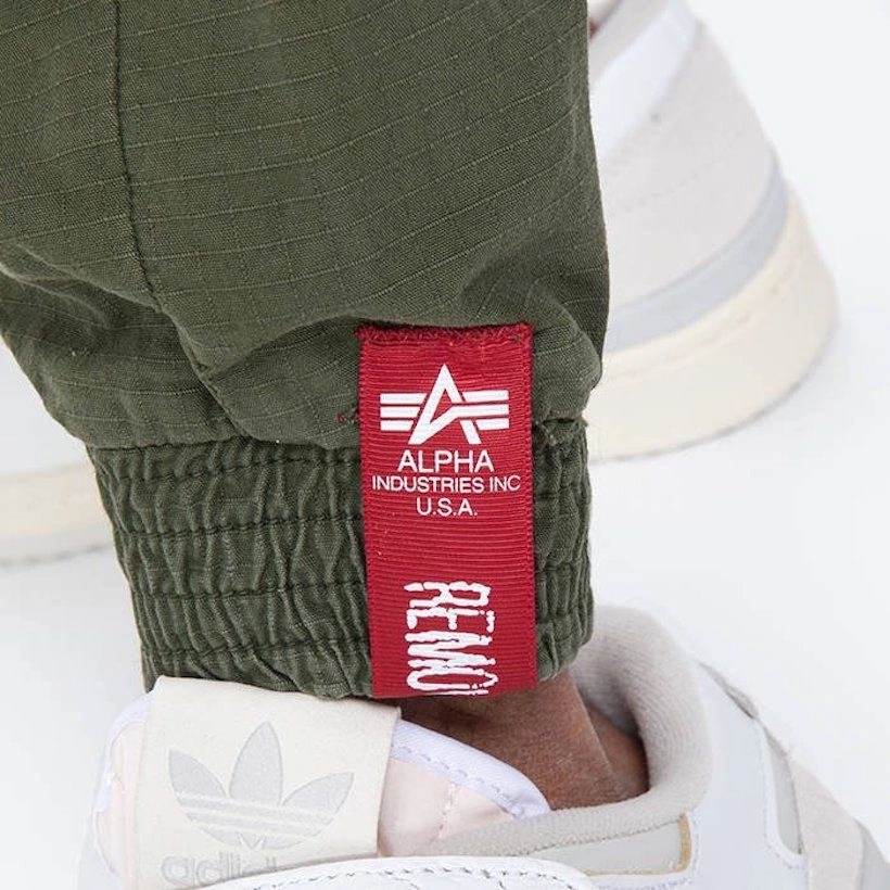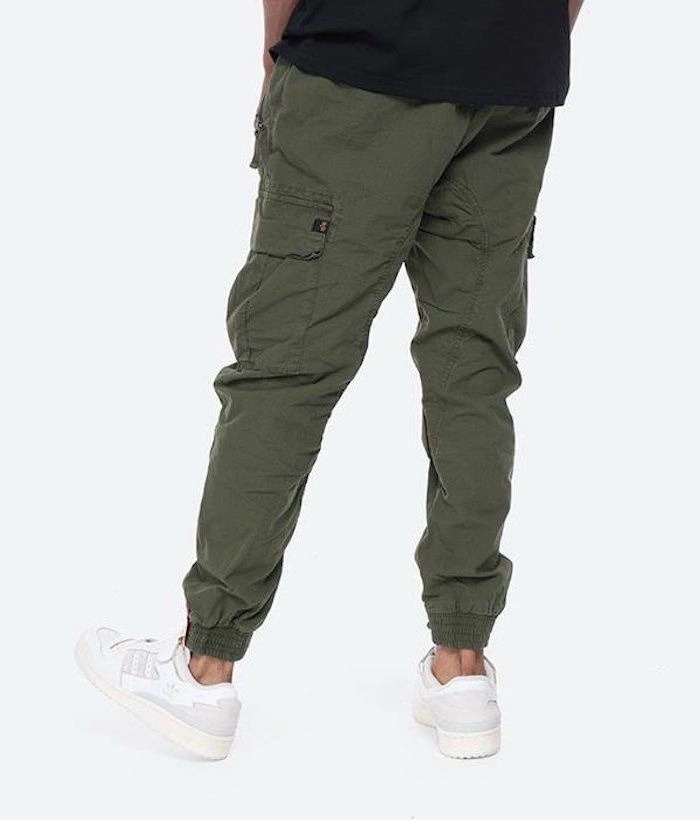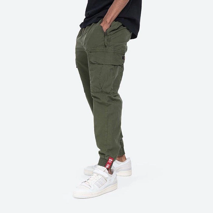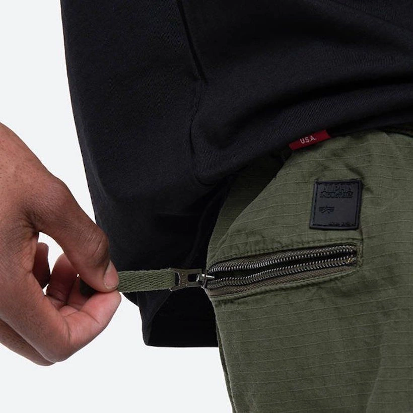 Joggery Alpha Industries posiadają dwie kieszenie boczne zapinane na suwaki oraz tylną kieszonkę, również zapinaną na zamek błyskawiczny. Na udach naszyte zostały typowe dla bojówek, pojemne kieszenie z klapami, zamykane na zatrzaski.