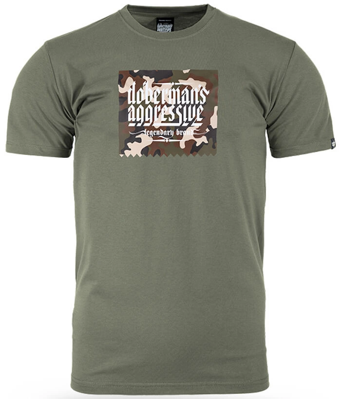 Koszulka Dobermans Aggressive Camo TS395, wykonana z bardzo dobrej dzianiny bawełnianej. Jest to militarna pozycja odzieży ulicznej, z dużym prostokątnym nadrukiem na piersiach w kolorystyce moro. Tył gładki.