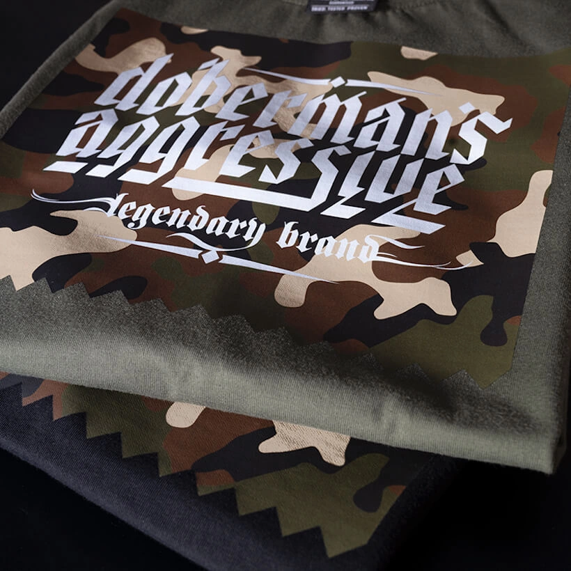 Koszulka Dobermans Aggressive Camo TS395, wykonana z bardzo dobrej dzianiny bawełnianej. Jest to militarna pozycja odzieży ulicznej, z dużym prostokątnym nadrukiem na piersiach w kolorystyce moro. Tył gładki.