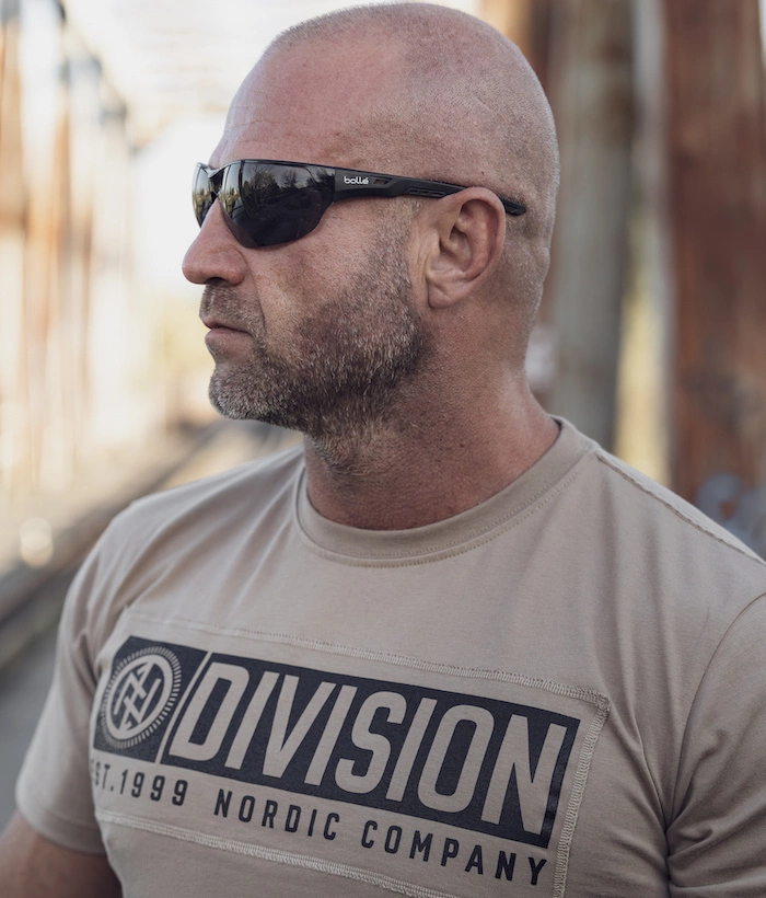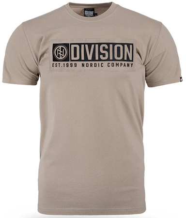 T-shirt na froncie posiada dużą prostokątną grafikę z napisem Division Nordic Company i logo z symbolem runicznym. Tył gładki. Nadruki wykonany techniką termotransferu.