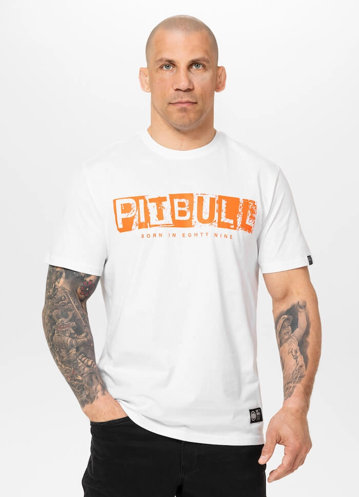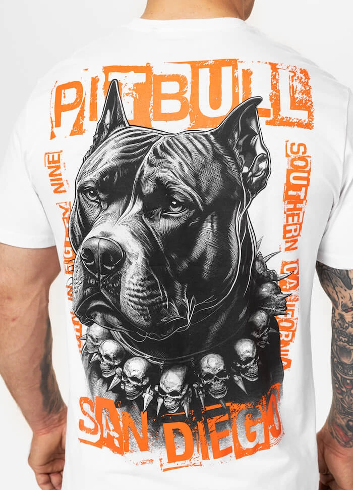 Ten t-shirt Pitbull na piersiach posiada napis firmowy wykonany charakterystyczną czcionką, a na plecach dużą grafikę - psa rasy pitbull wkomponowanego w grafikę spójną z przednim nadrukiem. Na dole i na rękawku wszyte są żakardowe metki firmowe.