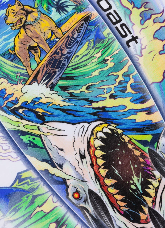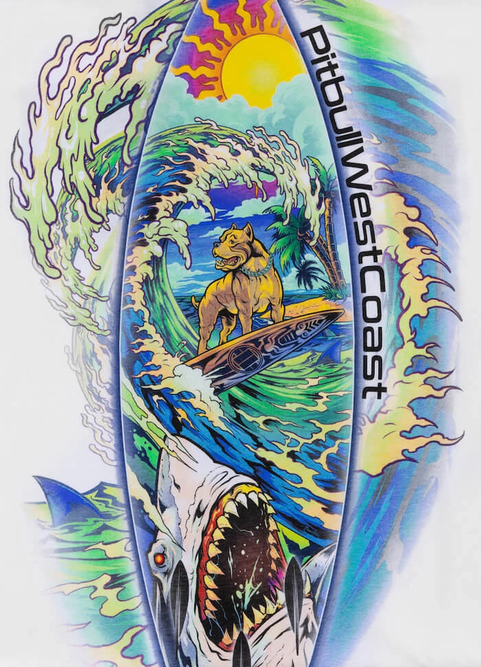 T-shirt ten posiada na plecach okazały nadruk w wakacyjnym klimacie, o tematyce surfingu. Na piersiach duży napis firmowy. Na dole i na rękawku wszyte są żakardowe metki firmowe.