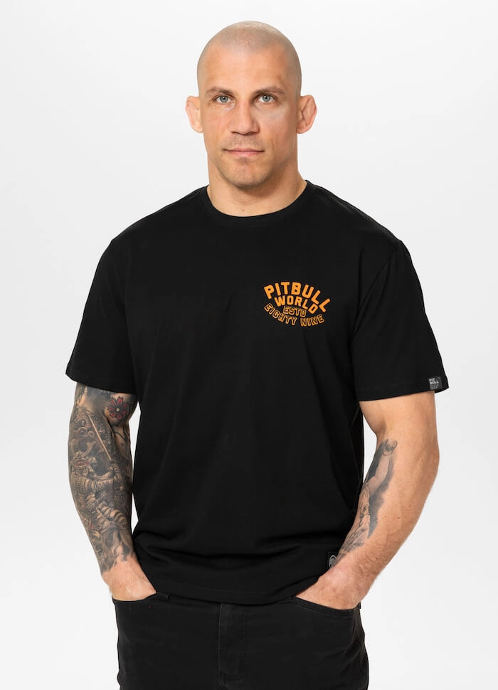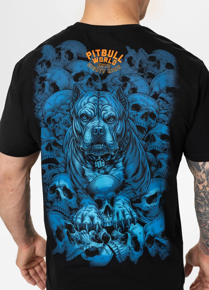Ten t-shirt Pitbull na piersi posiada mały napis firmowy, a na plecach konkretną grafikę - złowrogiego psa bojowego na tle trupich czaszek. Na dole i na rękawku wszyte są żakardowe metki firmowe.