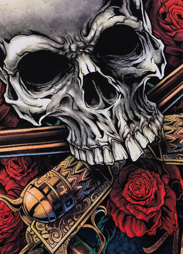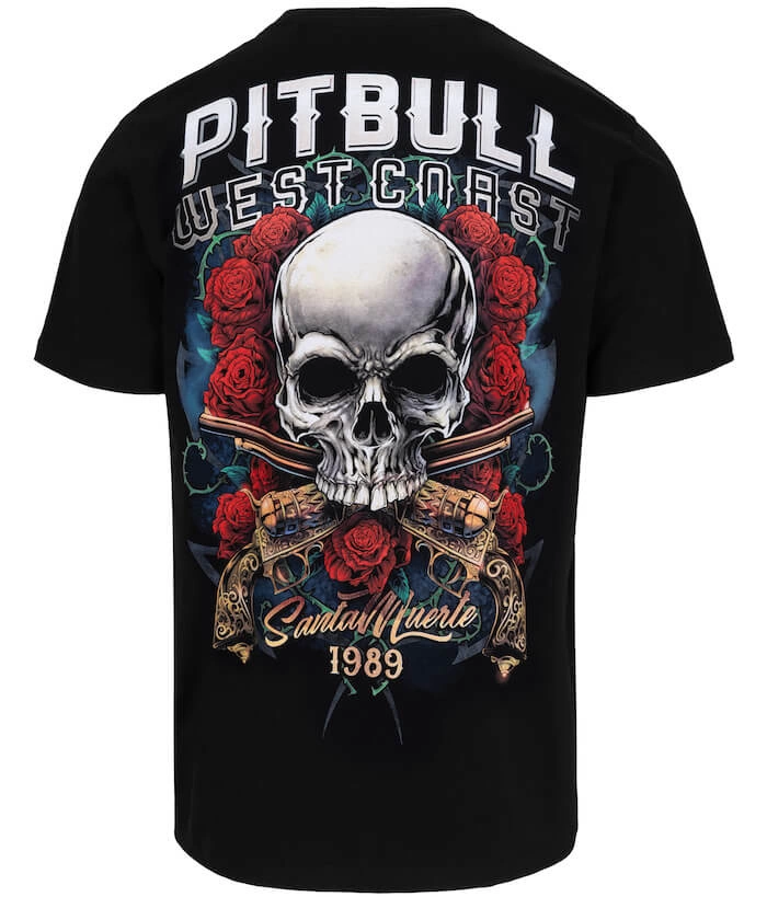 Jak każdy t-shirt Pit Bull, również i ten opowiada jakąś historię. Jest to wyrazista propozycja graficzna, której tematyką jest Święta Śmierć - zakazany kult, popularny w krajach Ameryki Łacińskiej, zwłaszcza w Meksyku, gdzie Santa Muerte jest uważana za patronkę przemytników i gangsterów. Główny motyw widnieje na plecach i jest to rozbudowana grafika z trupią czaszką, otoczoną różami. Na dole i na rękawku wszyte są żakardowe metki firmowe.