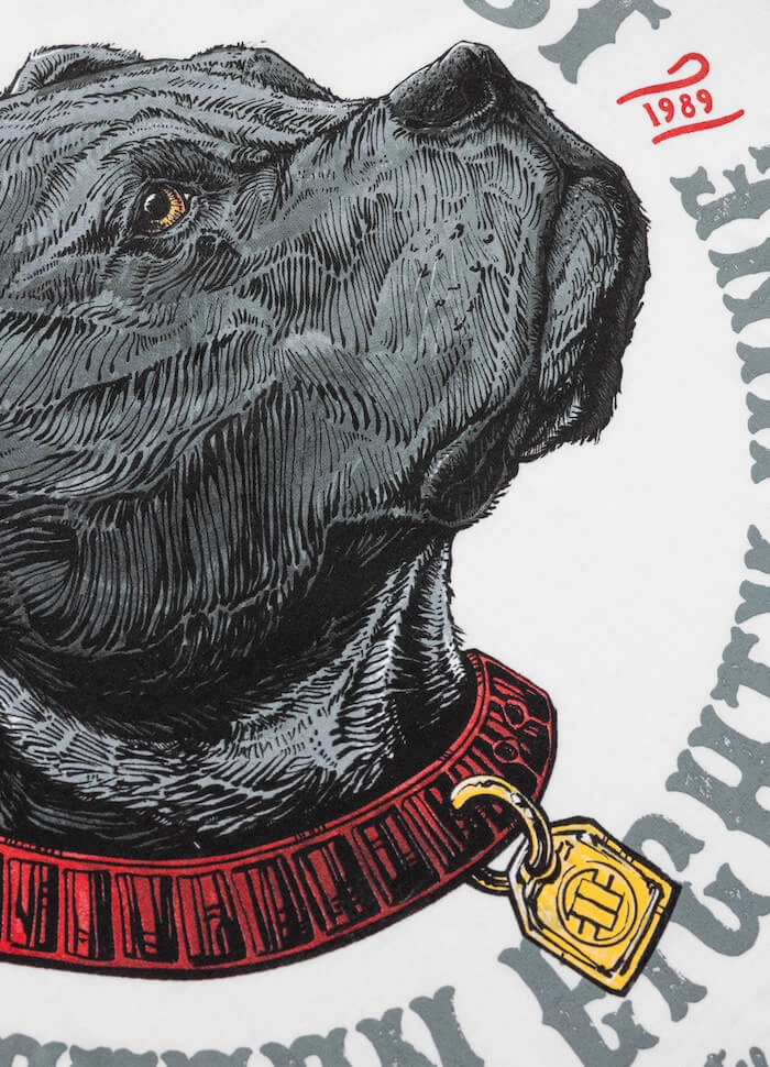 Z przodu i z tyłu posiada nadruki o wyrazistej stylistyce, opartej na tematyce psów bojowych. Klasyka odzieży ulicznej!