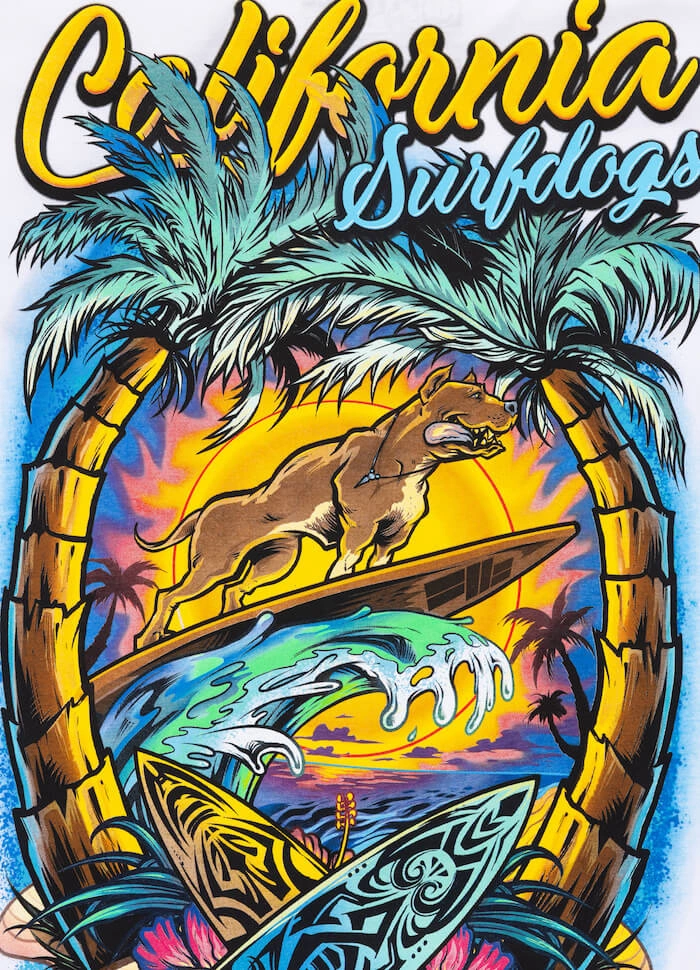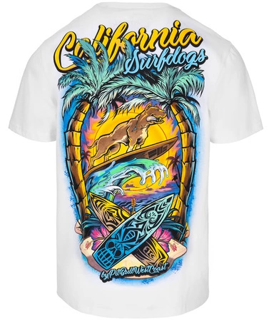 T-shirt ten posiada na plecach okazały nadruk w wakacyjnym klimacie, o tematyce surfingu. Na piersiach duży napis firmowy. Na dole i na rękawku wszyte są żakardowe metki firmowe.