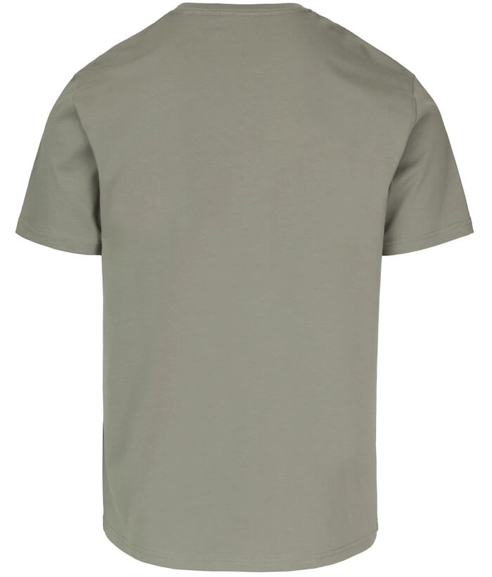 T-shirt został uszyty z wysokogatunkowej bawełny, odpornej na odkształcenia i wytrzymałej. Cechuje się też dobrą gramaturą (170 g/m2) oraz jedwabną lamówką umieszczoną na szyi, chroniącą skórę przed otarciami. Na dole i na rękawku wszyte są żakardowe metki firmowe.